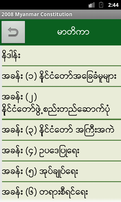 ၂၀၀၈ ခုႏွစ္က ထုတ္လုပ္တဲ့ အေျခခံဥပေဒအေၾကာင္းပါ။ အဂၤလိပ္လိုေကာ ၊ ျမန္မာလိုေကာ ပါတယ္။ ကြ်န္ေတာ္ေတာ့ဖတ္ၿပီးသြားၿပီ Google Play Store ကေန install လုပ္ရတာပါ။ share တဲ့သူေတြမရွိလို႔ ကြ်န္ေတာ္က ျပန္လည္ေ၀မွ်လိုက္ပါတယ္။ ေရးထားတာေတာ့ စံုေနတာပဲ။ Offline အေနနဲ႔ ဖတ္ရွုလို႔ ရၿပီး လြယ္ကူပါတယ္။ စက္တင္ဘာ ၁၃ ၂၀၁၃ update ပါ။ ပိုၿပီးသိခ်င္ရင္ေတာ့ Play Store မွာဖတ္ၾကည့္ပါ။ အဆင္ေျပပါေစ။
